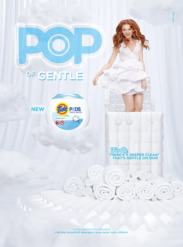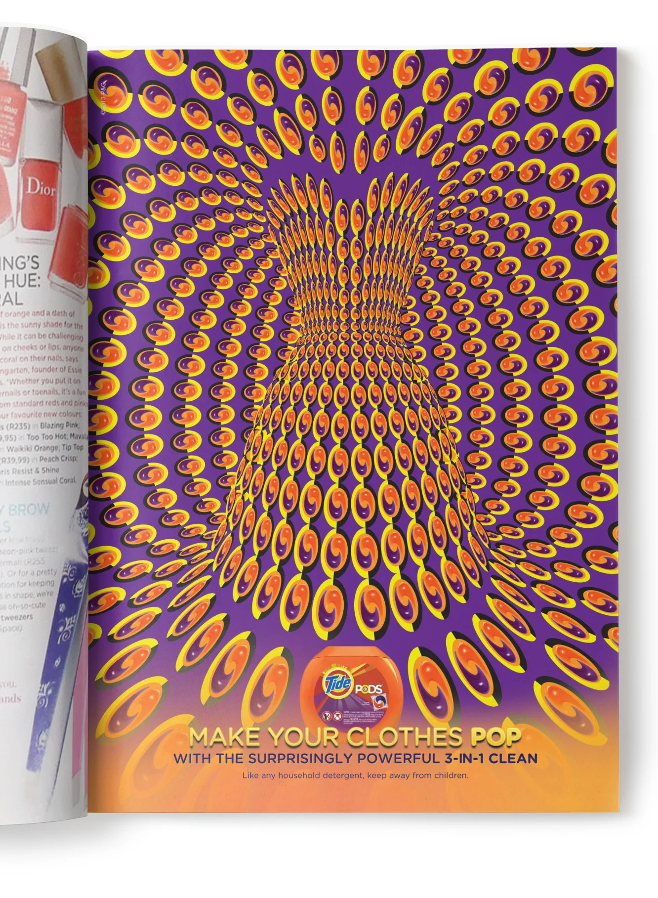 Tide Pods were designed to make your clothes really pop. So we created an optical illusion using the actual Pod form that pops off the page.